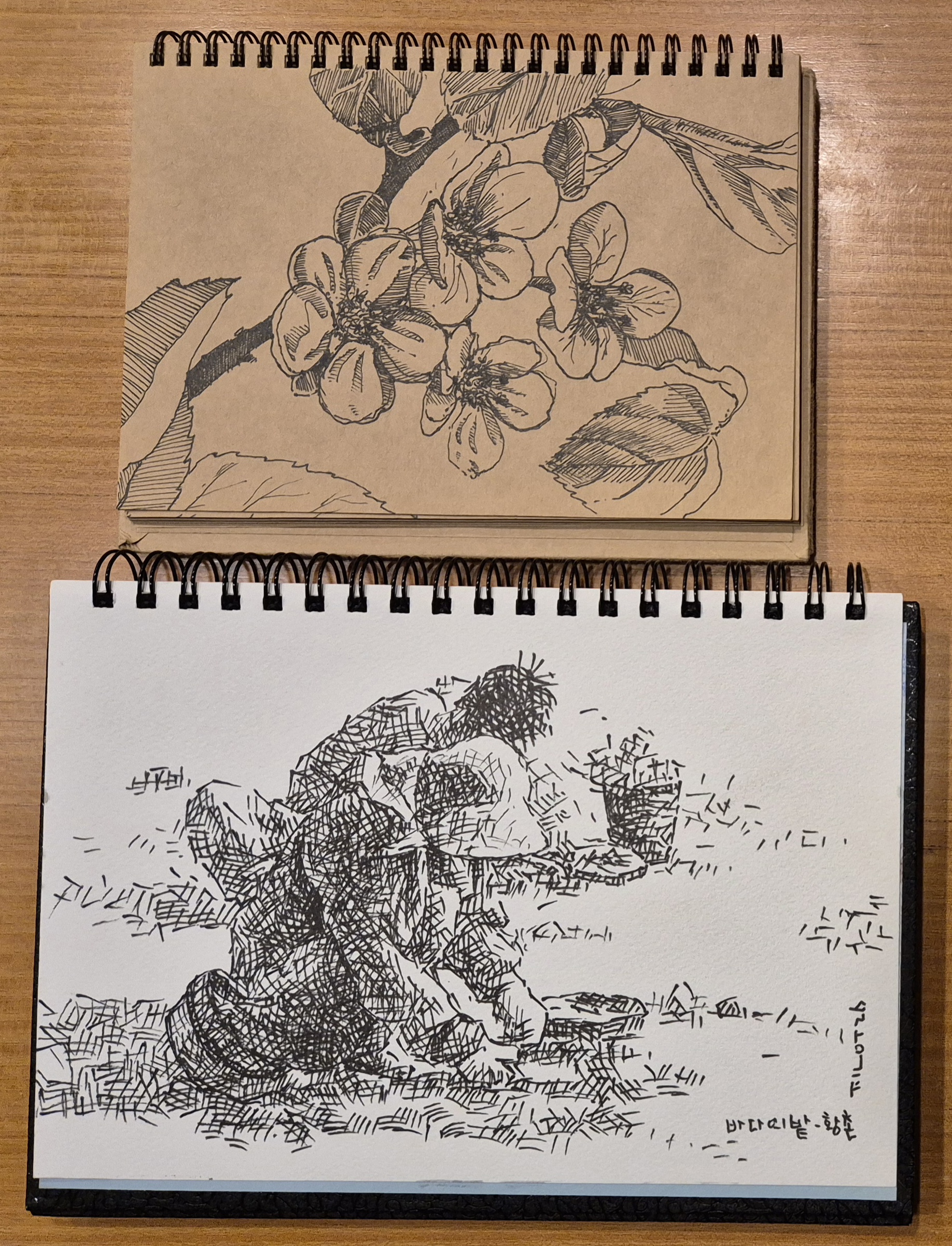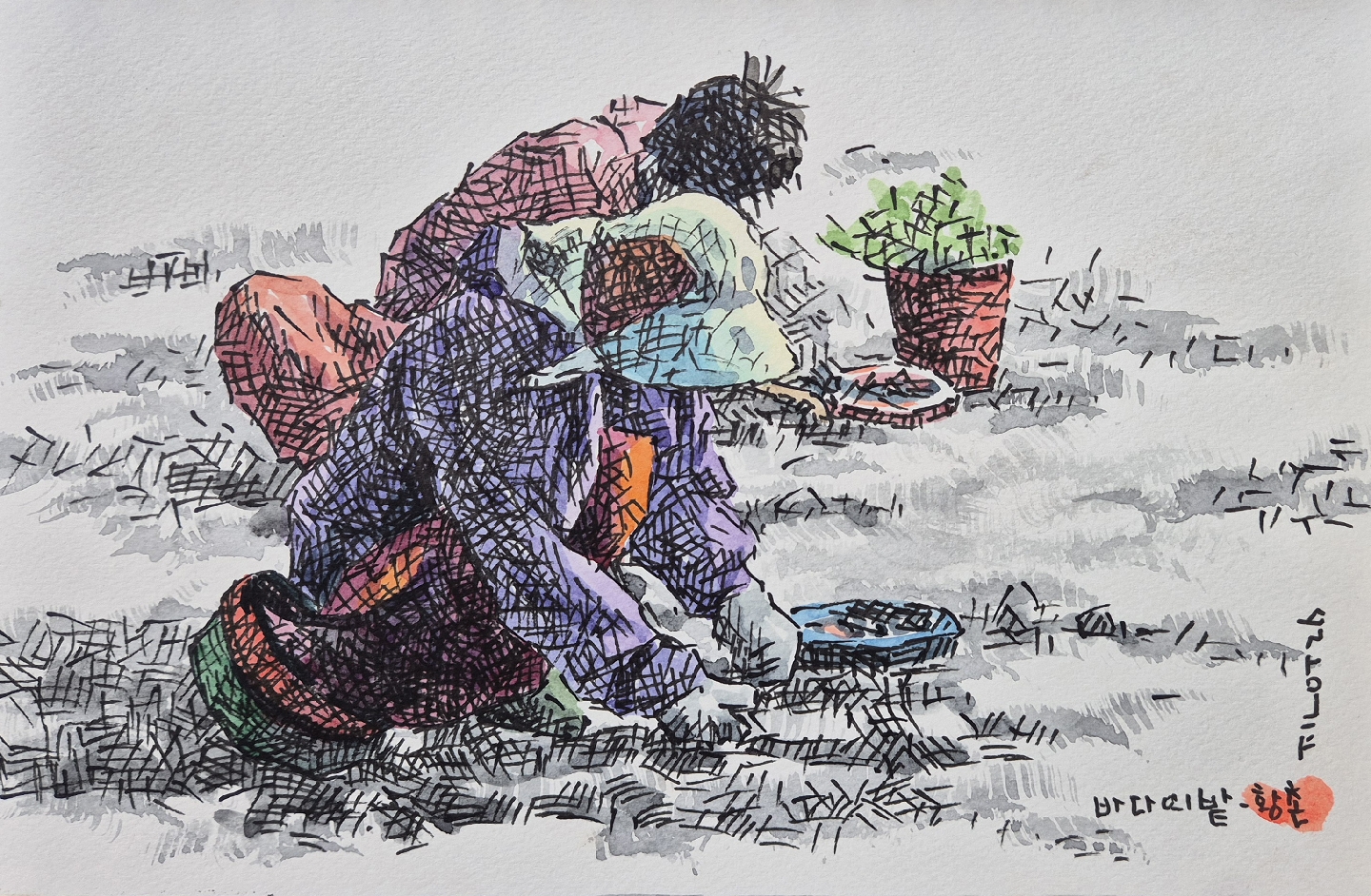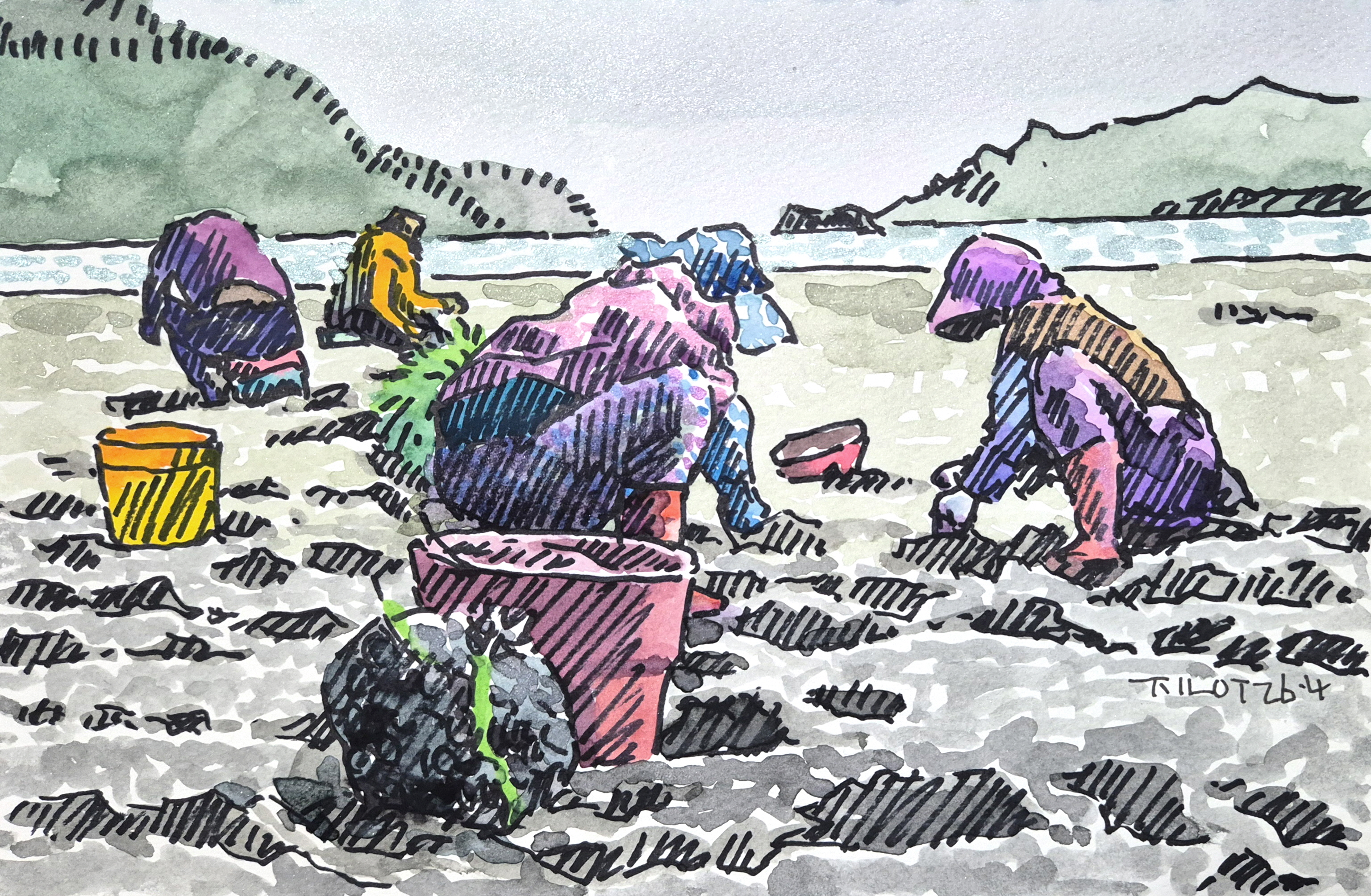 [펜담채]바다의 밭-바지락캐기4[펜담채]바다의 밭-바지락캐기4 /17*26cm /종이에 펜스케치, 담채 /2026.4 바지락캐기3으로 마치려고 했는데 스케치북 마지막 페이지가 있어하던 바지락캐기를 한장 더 그렸다.굵은펜으로 선을 긋고이번에는 의도적으로 외곽선을 긋지 않고 단선을 중첩시키고그 위에 채색하였다.이저런 물감중에 신한32색 정도가 쓰기 편하다스케치북을 주신 님께는 감사하다. #고흥 #도화면 #가화리 #황천마을 #갯벌 #바다의밭 #바지락
